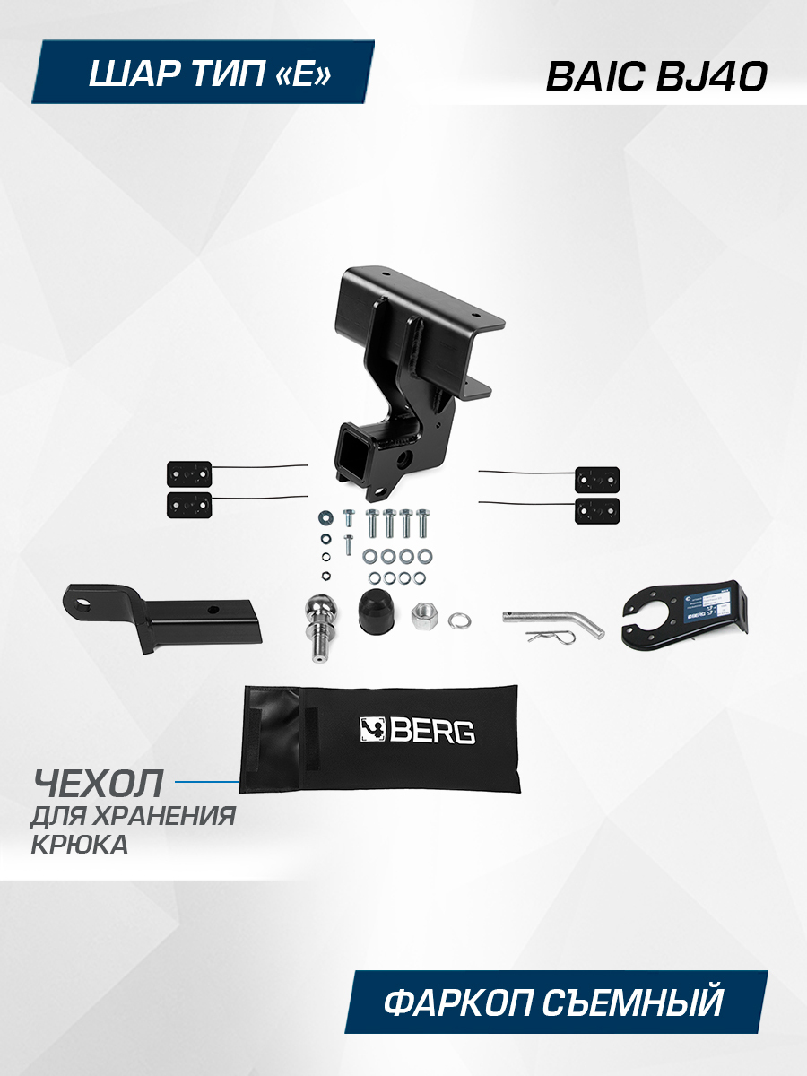 Фаркоп Berg для BAIC BJ40 2023-н.в., только для рынка РФ, шар E, 1500/75 кг, F.3411.002, Масса прицепа (макс. кг): 1500, Вертикальная нагрузка на крюк (макс. кг): 75, Тип шара: E, Вырез в бампере: не нужен, Паспорт, инструкция и сертификат в комплекте. Внимание: БЕЗ электрики в комплекте!