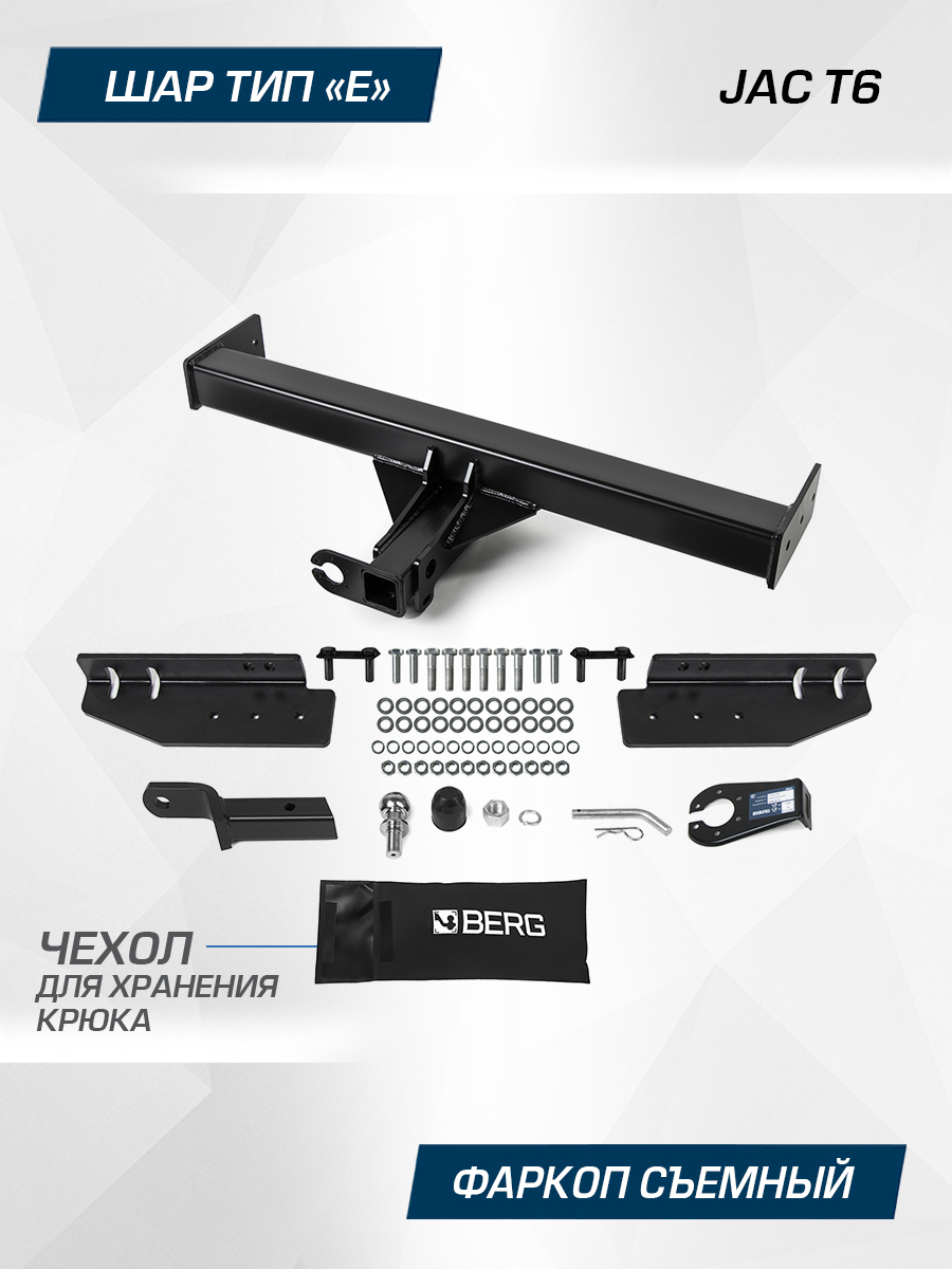 Фаркоп Berg для JAC T6 2018-н.в., шар E, 3500/120 кг, F.1413.002, Масса прицепа (макс. кг): 3500, Вертикальная нагрузка на крюк (макс. кг): 120, Тип шара: E, Вырез в бампере: не нужен, Паспорт, инструкция и сертификат в комплекте. Внимание: БЕЗ электрики в комплекте!