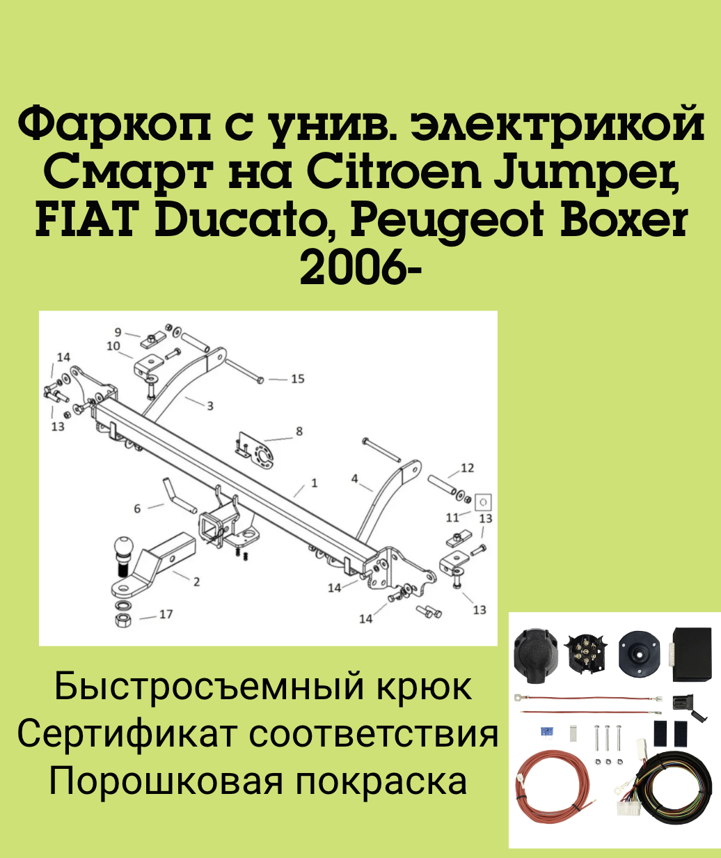 Фаркоп на Citroen Jumper VAN III L1, L2, L3, L4 2006-, FIAT Ducato III VAN L1, L2, L3, L4 2006-, Peugeot Boxer III VAN L1, L2, L3, L4 2006- без подрезки бампера. Тип шара: E (легкосъемный шар под квадрат). Нагрузки: 3300/160 кг. Комплектуется универсальной электрикой Smart Connect.