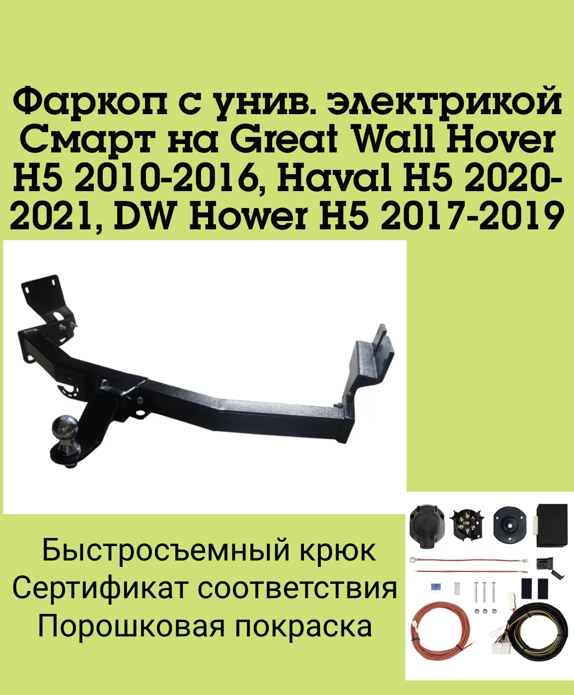 Тип шара:Легкосъёмный "американский" квадрат 50х50.; Вертикальная нагрузка на шар, кг:120.; Максимальная масса прицепа, кг:2800.; Резать бампер:Не надо.; Комплектуется универсальной электрикой Smart Connect
