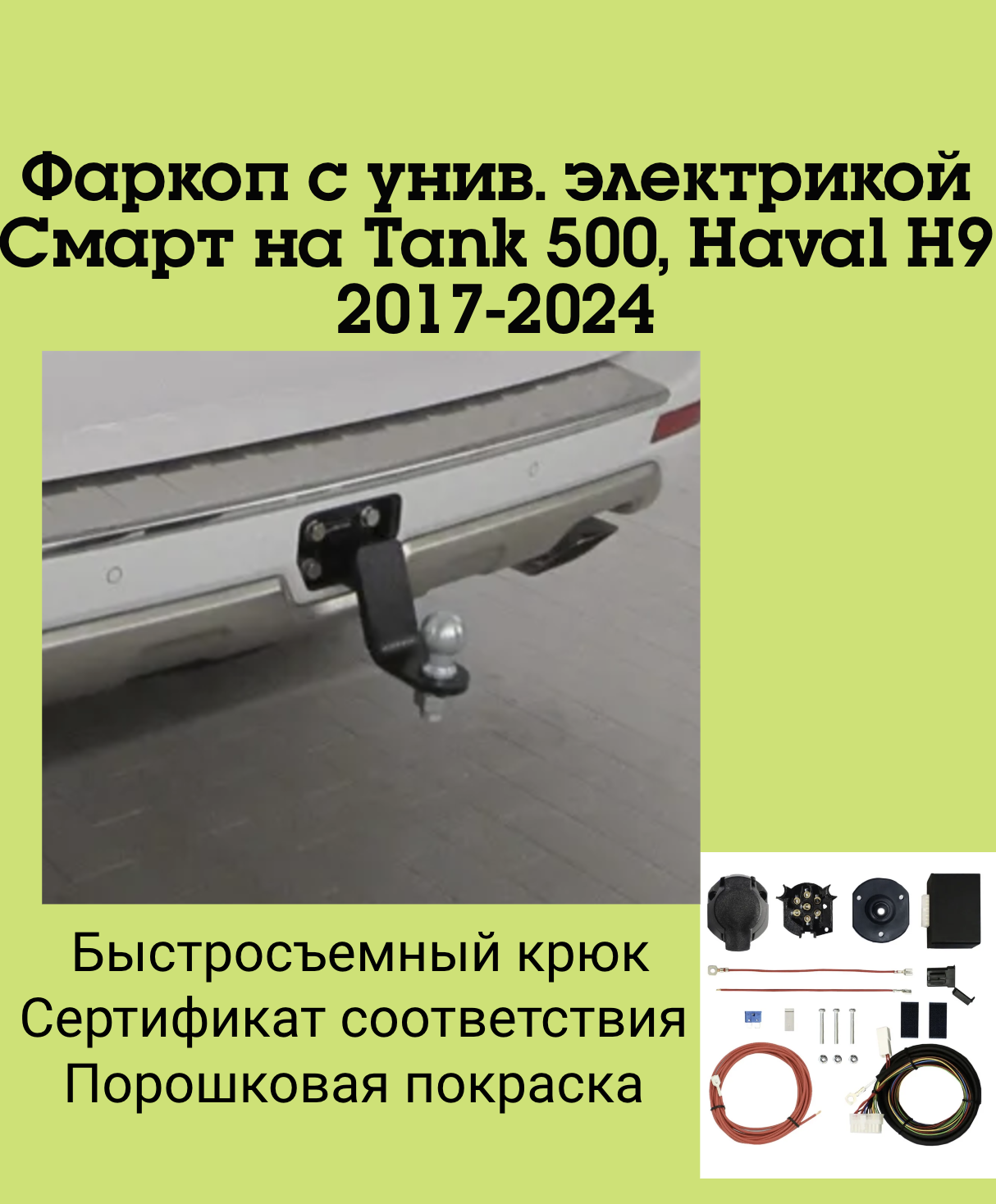 Тип шара:Несъемный вварной шар.; Вертикальная нагрузка на шар, кг:120.; Максимальная масса прицепа, кг:3000.; Резать бампер:; Комплектуется универсальной электрикой Smart Connect