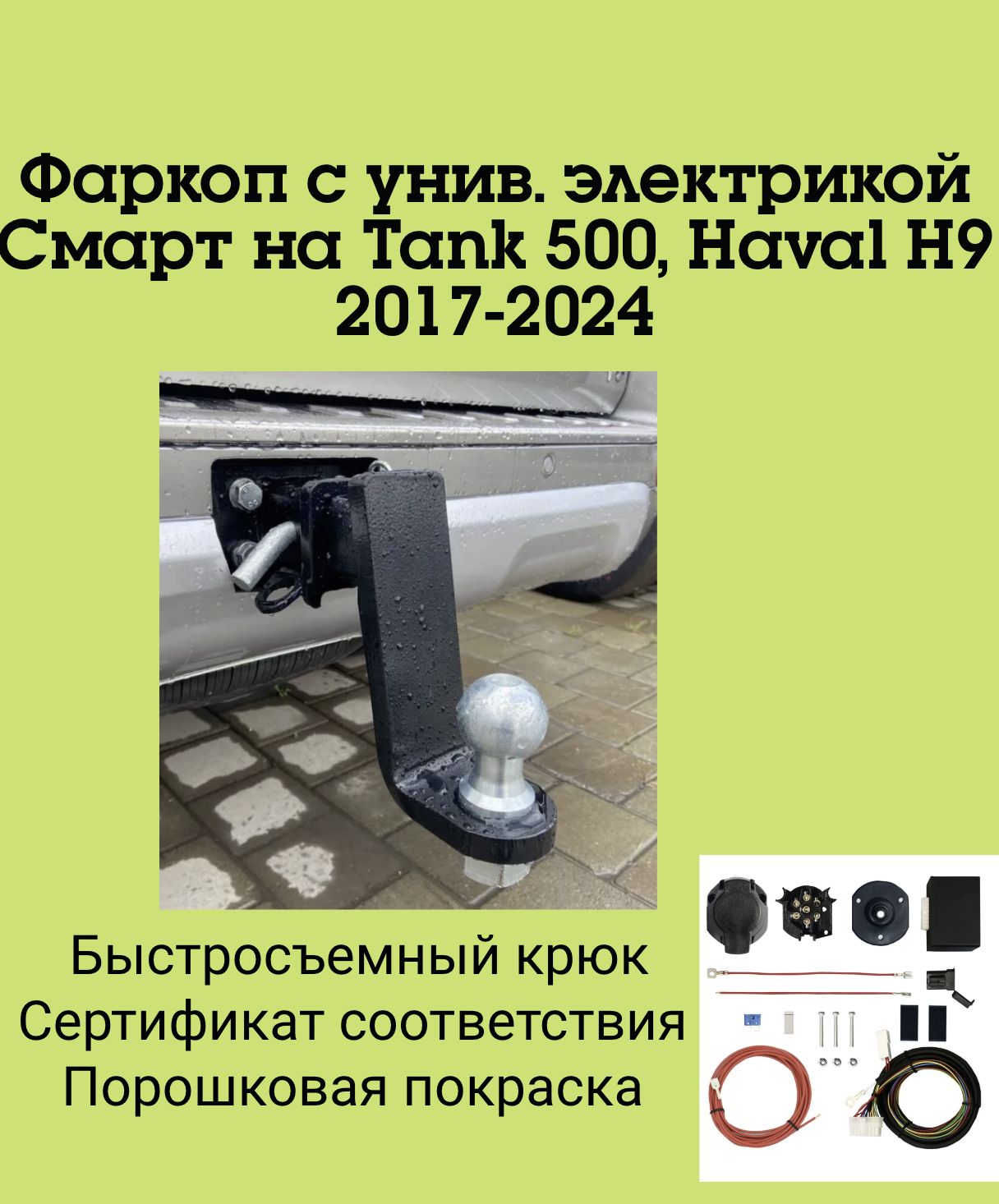 Тип шара:Легкосъёмный "американский" квадрат 50х50.; Вертикальная нагрузка на шар, кг:120.; Максимальная масса прицепа, кг:3000.; Резать бампер:; Комплектуется универсальной электрикой Smart Connect