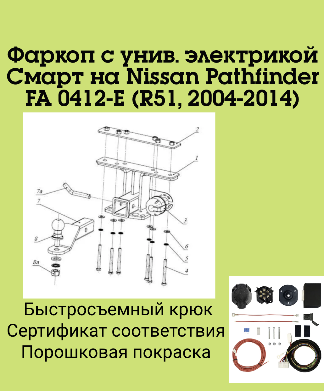 Тип шара:Легкосъёмный "американский" квадрат 50х50.; Вертикальная нагрузка на шар, кг:120.; Максимальная масса прицепа, кг:2300.; Резать бампер:Надо.;