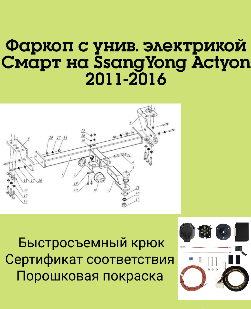 Тип шара:Легкосъёмный "американский" квадрат 50х50.; Вертикальная нагрузка на шар, кг:120.; Максимальная масса прицепа, кг:3200.; Резать бампер:Не надо.;
