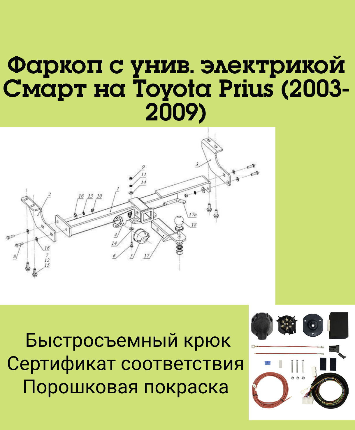 Тип шара:Легкосъёмный "американский" квадрат 50х50.; Вертикальная нагрузка на шар, кг:100.; Максимальная масса прицепа, кг:2200.; Резать бампер:Не надо.;