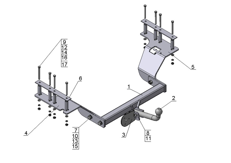 Тип шара: Условно съемный шар (на двух болтах).; Вертикальная нагрузка на шар, кг: 50.; Максимальная масса прицепа, кг: 1500.; Резать бампер: Не надо.; Паспорт и сертификат в комплекте. ВНИМАНИЕ! Без электрики.