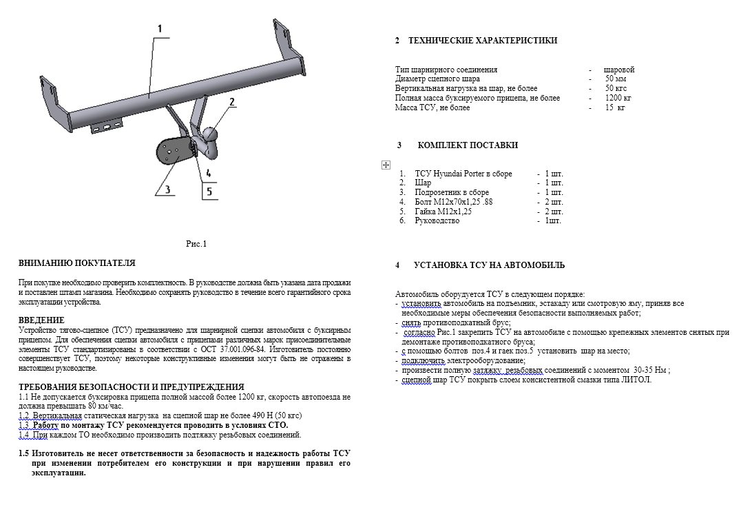 Тип шара: Условно съемный шар (на двух болтах).; Вертикальная нагрузка на шар, кг: 50.; Максимальная масса прицепа, кг: 1200.; Резать бампер: Не надо.; Паспорт и сертификат в комплекте. ВНИМАНИЕ! Без электрики.