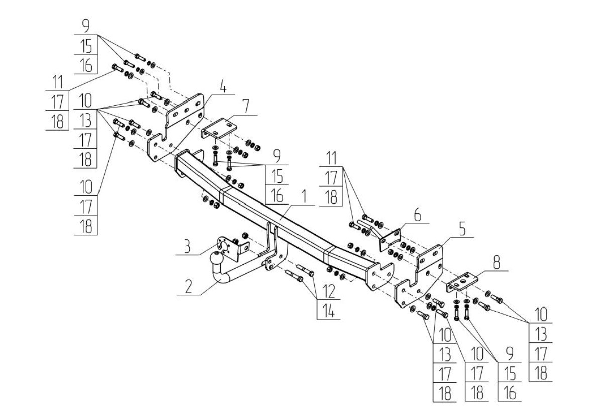 Тип шара: Условно съемный шар (на двух болтах).; Вертикальная нагрузка на шар, кг: 75.; Максимальная масса прицепа, кг: 1500.; Резать бампер: Вырез в бампере не виден.; Паспорт и сертификат в комплекте. ВНИМАНИЕ! Без электрики.