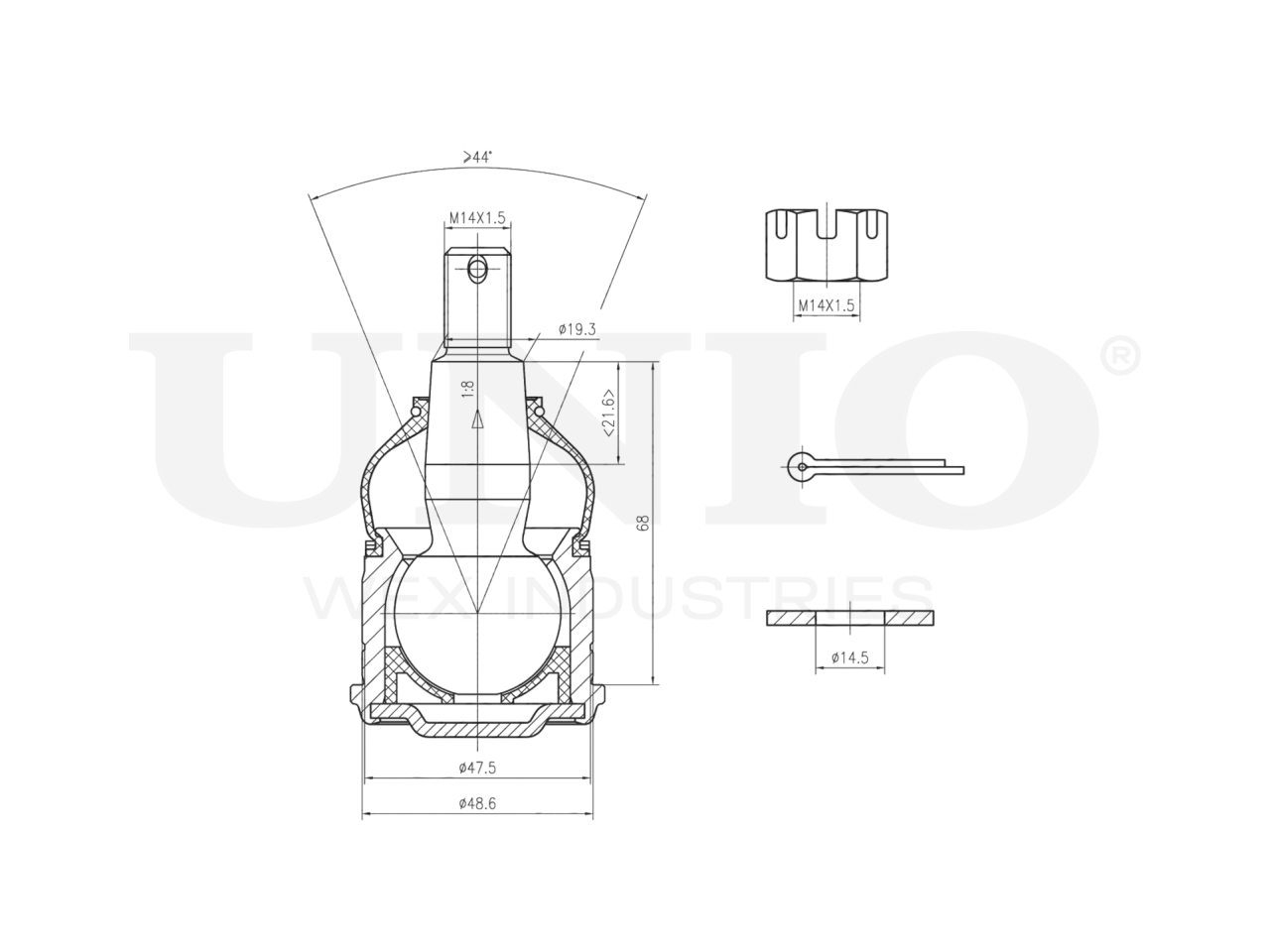 Артикул товара - SSP-20029, Сторона установки:Передняя ось, слева/справа,Снизу, Внутренний диаметр 1 [мм]:19.3, Внутренний диаметр 2 [мм]:22, Диаметр шарнира [мм]:48.6, Присоединительная винтовая резьба:M14x1,5, Размер конуса [мм]:19.3, EAN:4657808261681, EAN:4657808261681, Тип упаковки:коробка, Длина упаковки [мм]:100, Ширина упаковки [мм]:100, Высота упаковки [мм]:80, Вес нетто [кг]:0,62, Вес брутто [кг]:0,66