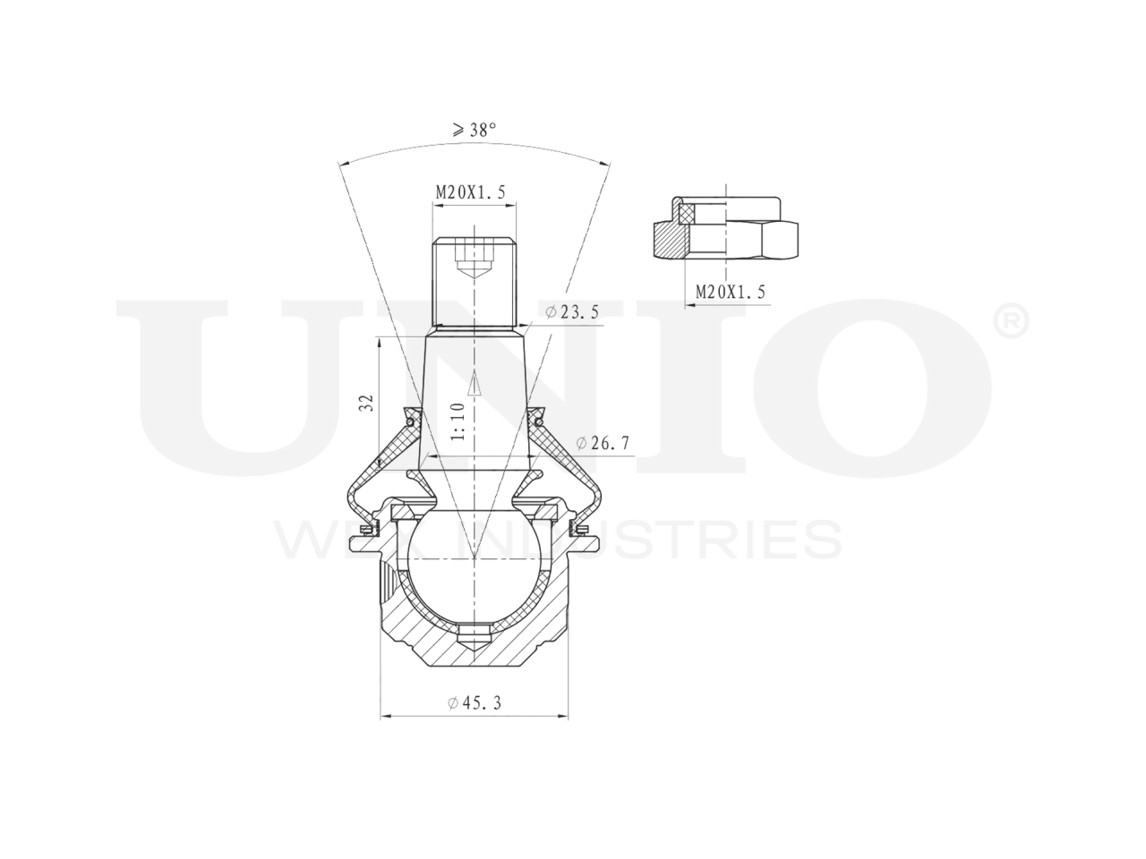 Артикул товара - SSP-20072, Сторона установки:Передняя ось, слева/справа,Сверху, Внутренний диаметр [мм]:23.5, Диаметр шарнира [мм]:45.3, Тип резьбы:Внешняя резьба, Размер резьбы:M20x1,5, Присоединительная винтовая резьба:M20x1,5, Размер конуса [мм]:23.5, EAN:4657808263548, EAN:4657808263548, Тип упаковки:коробка, Длина упаковки [мм]:100, Ширина упаковки [мм]:100, Высота упаковки [мм]:80, Вес нетто [кг]:0,7, Вес брутто [кг]:0,74