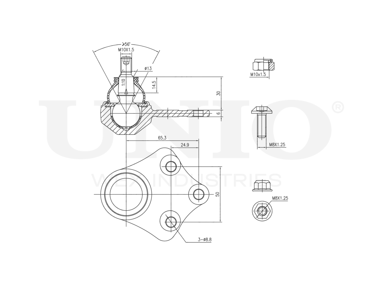 Артикул товара - SSP-20140, Сторона установки:Передняя ось, слева/справа,Сверху, Внутренний диаметр [мм]:13, Тип резьбы:Внешняя резьба, Размер резьбы:M10x1,5, Присоединительная винтовая резьба:M10x1,5, Размер конуса [мм]:13, EAN:4657808268277, EAN:4657808268277, Тип упаковки:коробка, Длина упаковки [мм]:100, Ширина упаковки [мм]:100, Высота упаковки [мм]:80, Вес нетто [кг]:0,31, Вес брутто [кг]:0,35