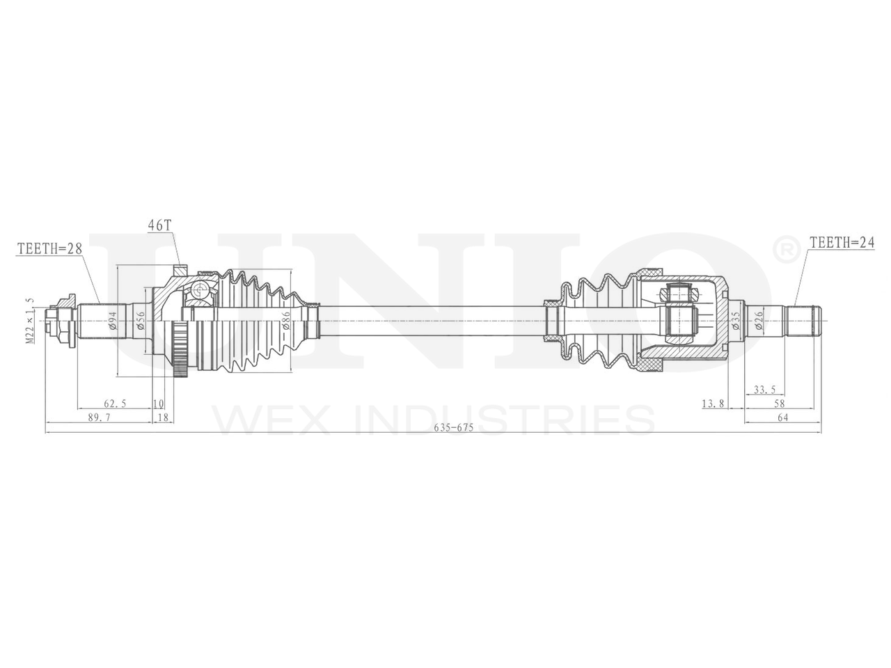 Артикул товара - CVJ-10112, Сторона установки:Передний мост слева, Внешнее зацепление со стороны колеса:28, Внешнее зацепление со стороны дифференциала:24, Внутреннее зубчатое соединение со стороны дифференциала:22, Внутренне зубчатое соединение со стороны колеса:22, Диаметр прокладки [мм]:56, Число зубцов кольца ABS:46, Длина [мм]:635, Диаметр 2 [мм]:77, Диаметр шарнира [мм]:78.5, Кольцо-ABS, диам. [мм]:94, Размер резьбы:M22x1,5, EAN:4657814483374, EAN:4657814483374, Тип упаковки:коробка, Длина упаковки [мм]:705, Ширина упаковки [мм]:120, Высота упаковки [мм]:120, Вес нетто [кг]:5,15, Вес брутто [кг]:5,89