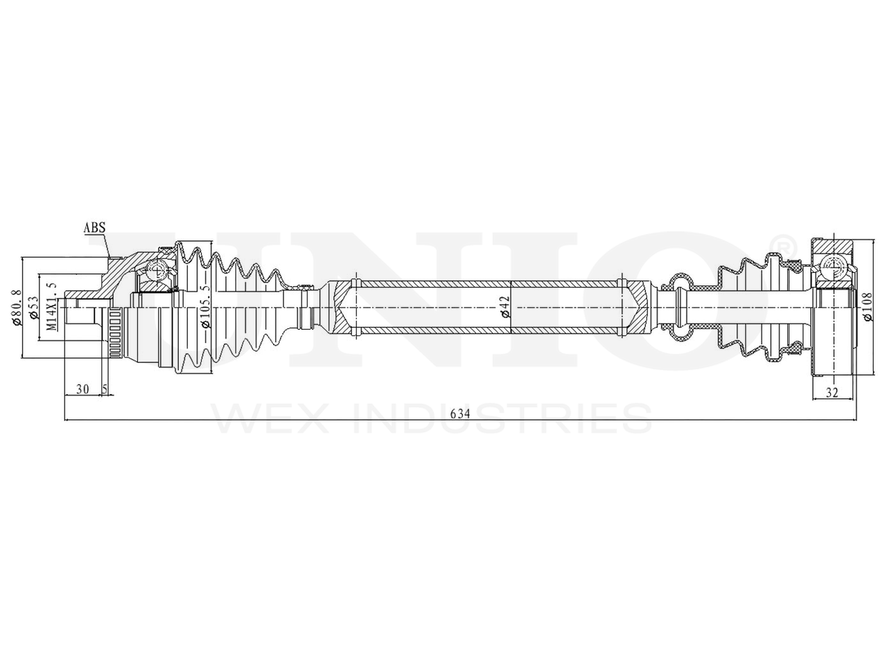 Артикул товара - CVJ-10097, Сторона установки:Передний мост справа, Внешнее зацепление со стороны колеса:33, Внутреннее зубчатое соединение со стороны дифференциала:28, Внутренне зубчатое соединение со стороны колеса:30, Диаметр прокладки [мм]:53, Число зубцов кольца ABS:45, Длина [мм]:634, Диаметр 2 [мм]:108, Диаметр шарнира [мм]:88, Кольцо-ABS, диам. [мм]:80.8, Размер резьбы:M14x1,5, EAN:4657814483220, EAN:4657814483220, Тип упаковки:коробка, Длина упаковки [мм]:705, Ширина упаковки [мм]:120, Высота упаковки [мм]:120, Вес нетто [кг]:6,94, Вес брутто [кг]:7,68