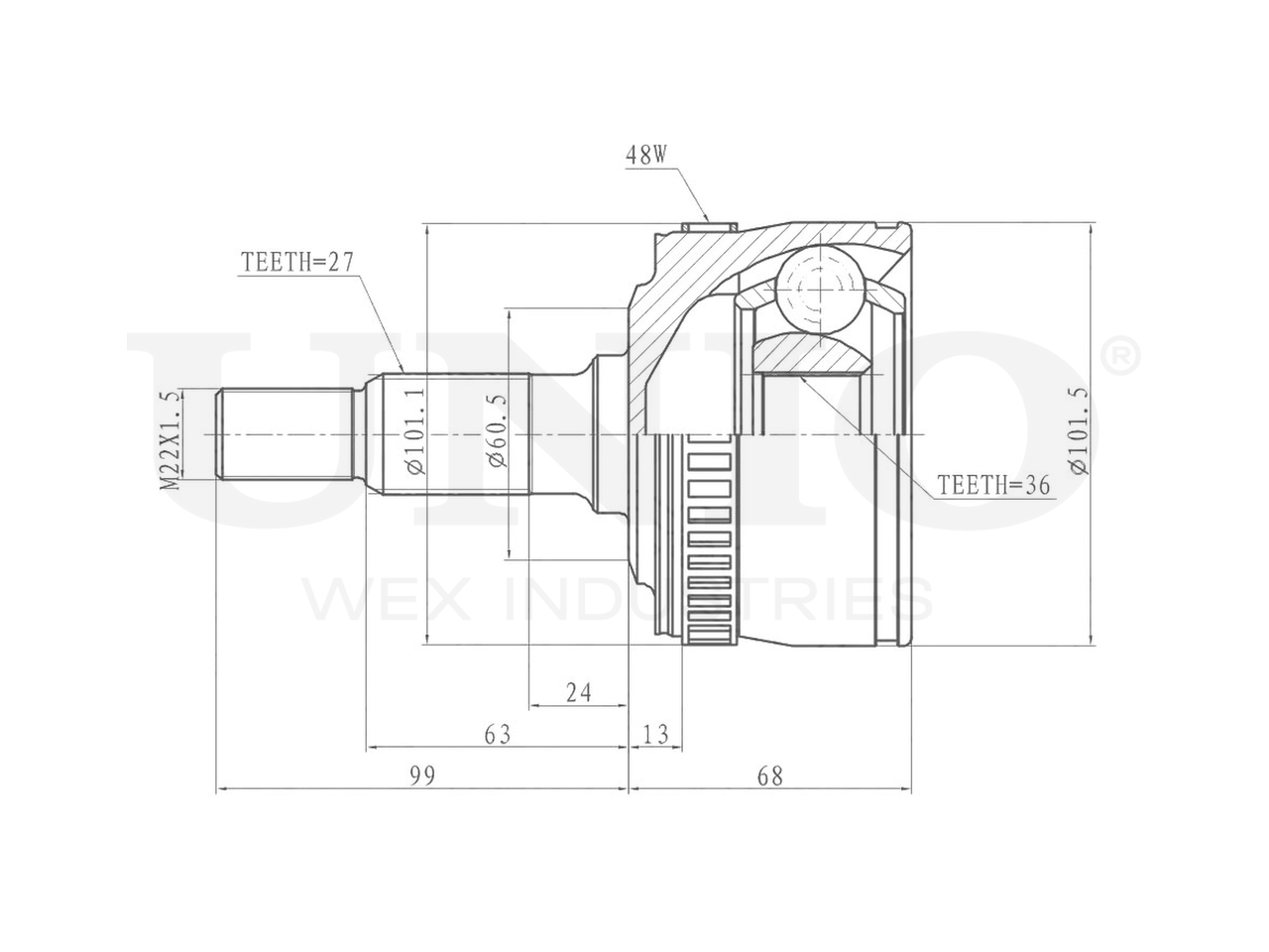 Артикул товара - CVJ-20064, Сторона установки:Передний мост, Внешнее зацепление со стороны колеса:27, Внутренне зубчатое соединение со стороны колеса:36, Диаметр прокладки [мм]:71.5, Число зубцов кольца ABS:48, Длина [мм]:167, Диаметр шарнира [мм]:101.5, Кольцо-ABS, диам. [мм]:101.1, Размер резьбы:M22x1,5, EAN:4657814484258, EAN:4657814484258, Тип упаковки:коробка, Длина упаковки [мм]:115, Ширина упаковки [мм]:115, Высота упаковки [мм]:200, Вес нетто [кг]:3,36, Вес брутто [кг]:3,56