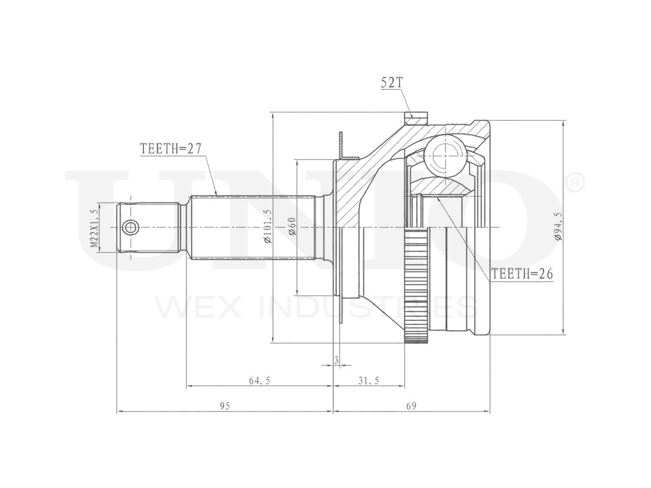 Артикул товара - CVJ-20079, Сторона установки:Передний мост, Внешнее зацепление со стороны колеса:27, Внутренне зубчатое соединение со стороны колеса:26, Диаметр прокладки [мм]:60, Число зубцов кольца ABS:52, Длина [мм]:164, Диаметр шарнира [мм]:94.5, Кольцо-ABS, диам. [мм]:101.5, Размер резьбы:M22x1,5, EAN:4657814484401, EAN:4657814484401, Тип упаковки:коробка, Длина упаковки [мм]:115, Ширина упаковки [мм]:115, Высота упаковки [мм]:200, Вес нетто [кг]:2,69, Вес брутто [кг]:2,89