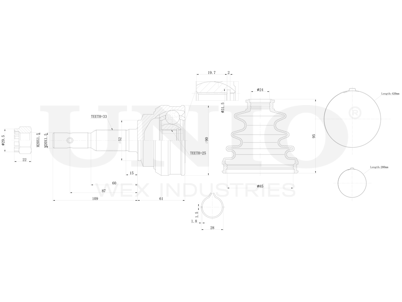 Артикул товара - CVJ-20096, Сторона установки:Передний мост справа, Внешнее зацепление со стороны колеса:33, Внутренне зубчатое соединение со стороны колеса:25, Диаметр прокладки [мм]:52, Длина [мм]:170, Диаметр шарнира [мм]:90, Размер резьбы:M20x1,5, EAN:4657814484579, EAN:4657814484579, Тип упаковки:коробка, Длина упаковки [мм]:115, Ширина упаковки [мм]:115, Высота упаковки [мм]:200, Вес нетто [кг]:2,23, Вес брутто [кг]:2,43