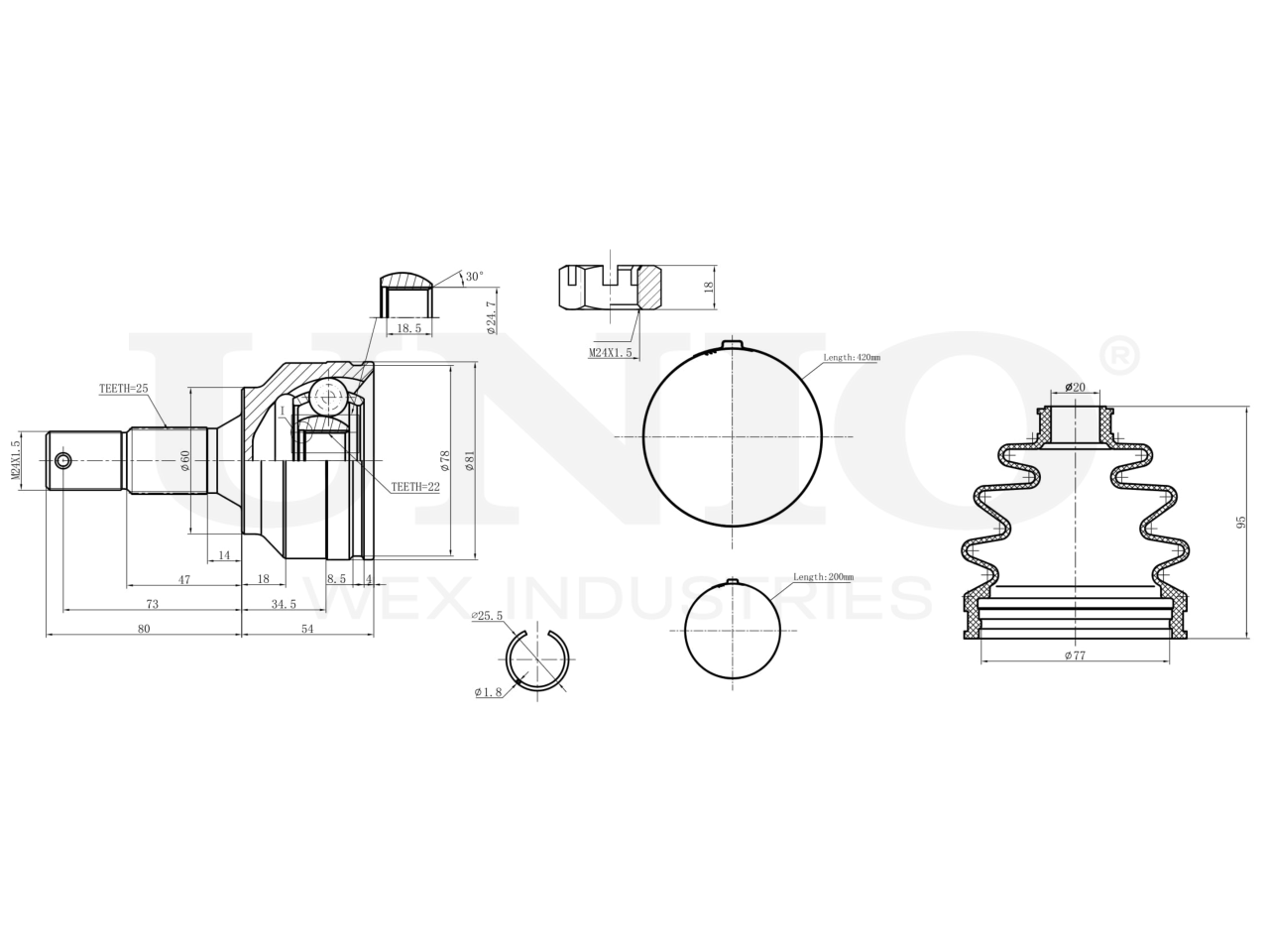 Артикул товара - CVJ-20168, Сторона установки:Передний мост, Внешнее зацепление со стороны колеса:25, Внутренне зубчатое соединение со стороны колеса:22, Диаметр прокладки [мм]:60, Длина [мм]:134, Диаметр шарнира [мм]:81, Размер резьбы:M24x1,5, EAN:4657814485293, EAN:4657814485293, Тип упаковки:коробка, Длина упаковки [мм]:115, Ширина упаковки [мм]:115, Высота упаковки [мм]:200, Вес нетто [кг]:2,01, Вес брутто [кг]:2,21