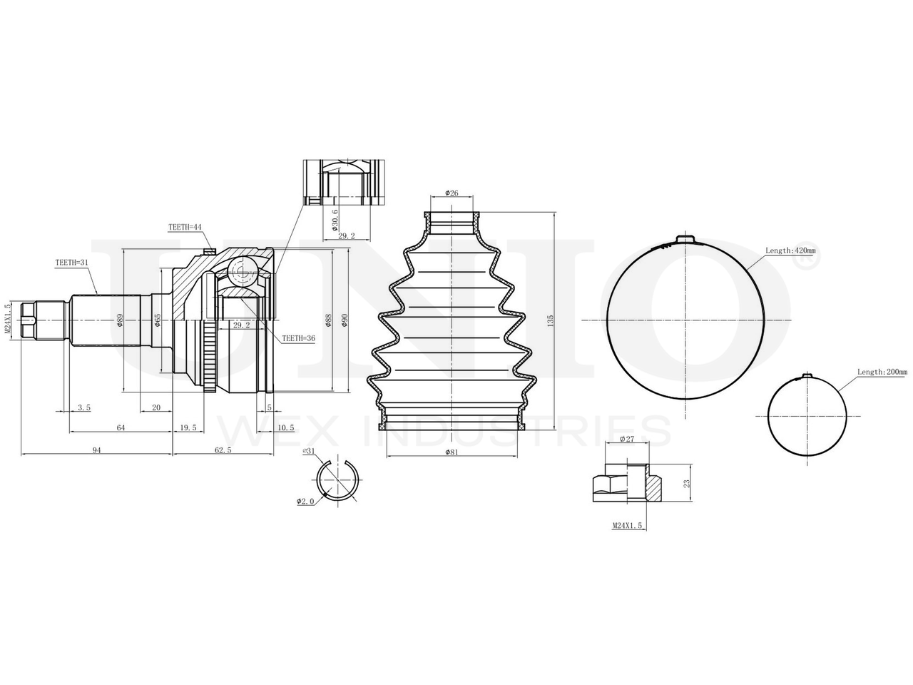 Артикул товара - CVJ-20217, Внешнее зацепление со стороны колеса:31, Внутренне зубчатое соединение со стороны колеса:36, Диаметр прокладки [мм]:65, Число зубцов кольца ABS:44, Длина [мм]:156.5, Диаметр шарнира [мм]:90, Кольцо-ABS, диам. [мм]:89, Размер резьбы:M24x1,5, EAN:4657814485774, EAN:4657814485774, Тип упаковки:коробка, Длина упаковки [мм]:115, Ширина упаковки [мм]:115, Высота упаковки [мм]:200, Вес нетто [кг]:2,64, Вес брутто [кг]:2,84