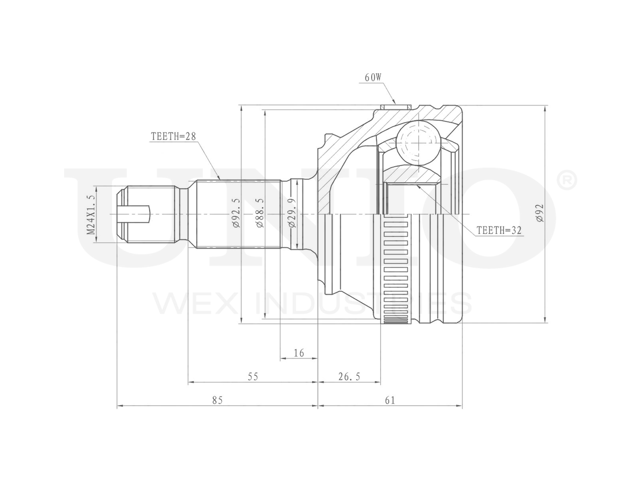 Артикул товара - CVJ-20265, Сторона установки:Передний мост, Внешнее зацепление со стороны колеса:28, Внутренне зубчатое соединение со стороны колеса:32, Диаметр прокладки [мм]:55.6, Число зубцов кольца ABS:60, Длина [мм]:146, Диаметр шарнира [мм]:92, Кольцо-ABS, диам. [мм]:92.5, Размер резьбы:M24x1,5, EAN:4657814486252, EAN:4657814486252, Тип упаковки:коробка, Длина упаковки [мм]:115, Ширина упаковки [мм]:115, Высота упаковки [мм]:200, Вес нетто [кг]:2,32, Вес брутто [кг]:2,52
