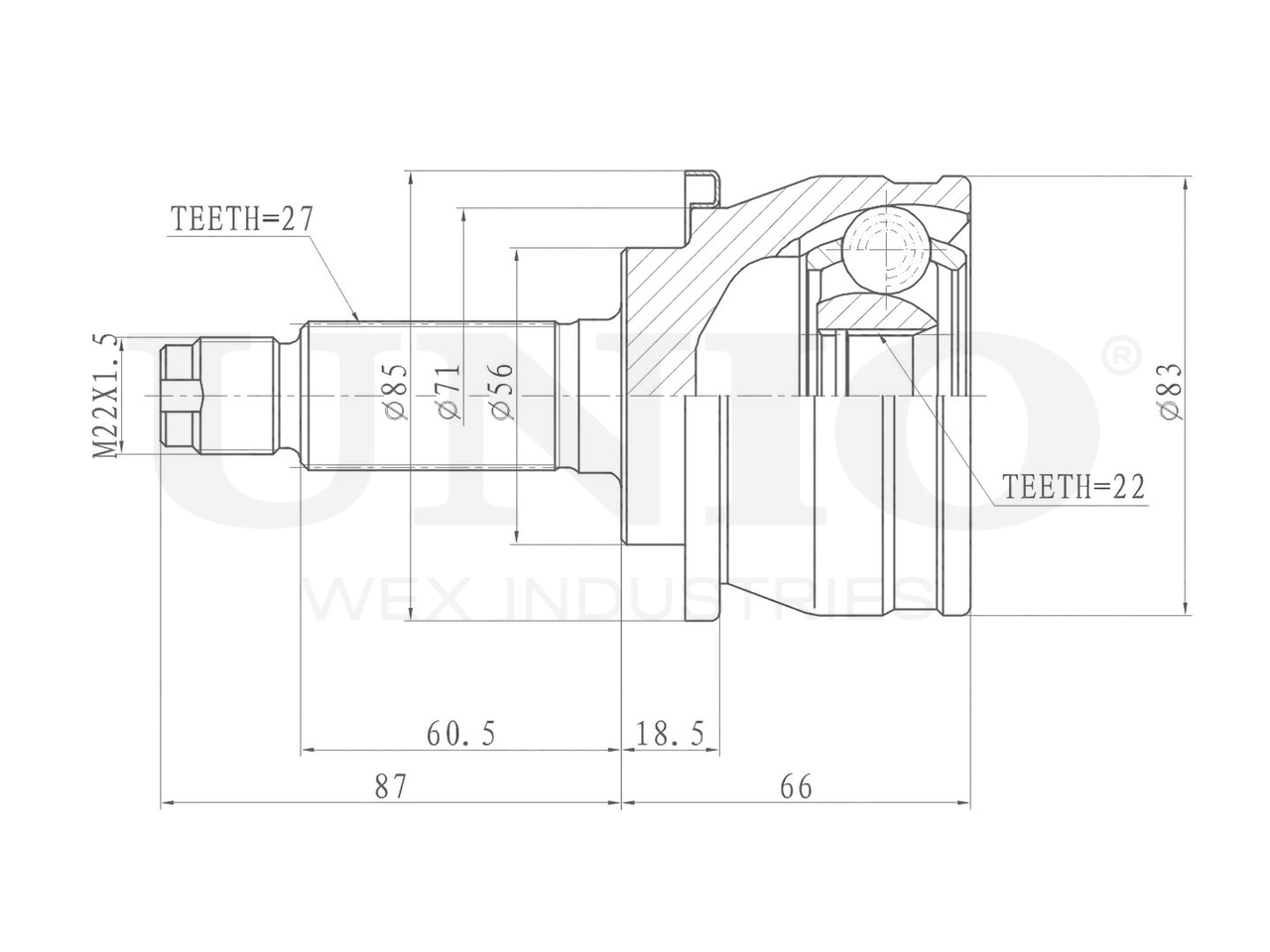 Артикул товара - CVJ-20314, Сторона установки:Передний мост, Внешнее зацепление со стороны колеса:27, Внутренне зубчатое соединение со стороны колеса:22, Диаметр прокладки [мм]:56, Длина [мм]:153, Диаметр шарнира [мм]:83, Размер резьбы:M22x1,5, EAN:4657814486740, EAN:4657814486740, Тип упаковки:коробка, Длина упаковки [мм]:115, Ширина упаковки [мм]:115, Высота упаковки [мм]:200, Вес нетто [кг]:2,28, Вес брутто [кг]:2,48