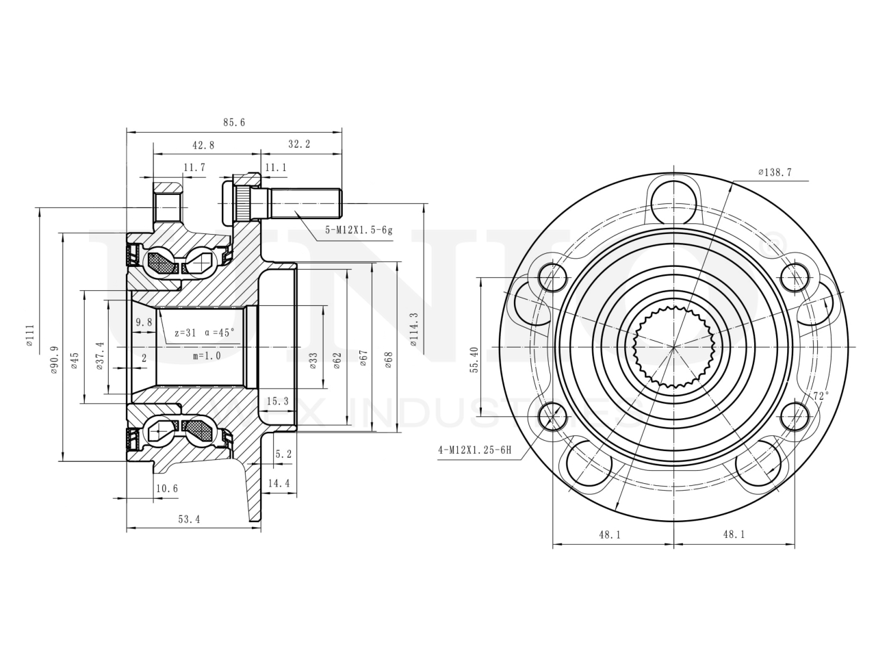 Артикул товара - HUB-20305, Наружный диаметр [мм]:90.9, Наружный диаметр 1 [мм]:68, Наружный диаметр 2 [мм]:138.7, Внутренний диаметр 1 [мм]:62, Ширина [мм]:85.6, Ширина 1 [мм]:42.8, Сторона установки:Передний мост, Число отверстий в диске колеса:5, Диаметр расположения крепёжных отверстий ступицы [мм]:114.3, Число зубцов:31, EAN:4657818888243, EAN:4657818888243, Тип упаковки:коробка, Длина упаковки [мм]:170, Ширина упаковки [мм]:160, Высота упаковки [мм]:120, Вес нетто [кг]:2,8, Вес брутто [кг]:3