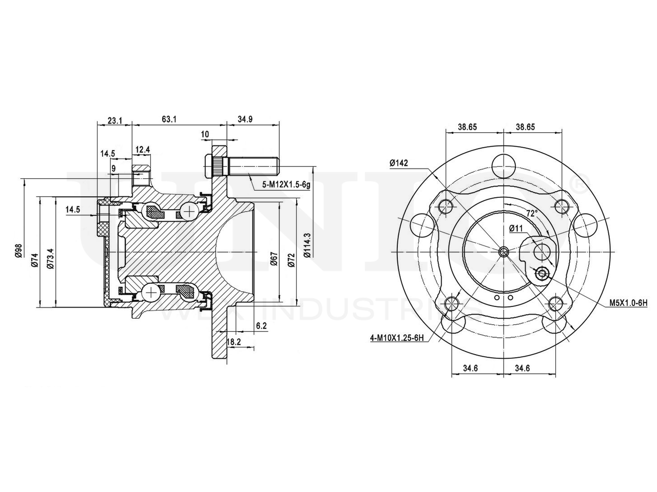 Артикул товара - HUB-20055, Наружный диаметр [мм]:142, Наружный диаметр 1 [мм]:67, Наружный диаметр 2 [мм]:73.4, Ширина 1 [мм]:63.1, Ширина 2 [мм]:121, Сторона установки:Задний мост, Число отверстий в диске колеса:5, Диаметр расположения крепёжных отверстий ступицы [мм]:114.3, EAN:4657817768003, EAN:4657817768003, Тип упаковки:коробка, Длина упаковки [мм]:170, Ширина упаковки [мм]:160, Высота упаковки [мм]:150, Вес нетто [кг]:3,25, Вес брутто [кг]:3,5