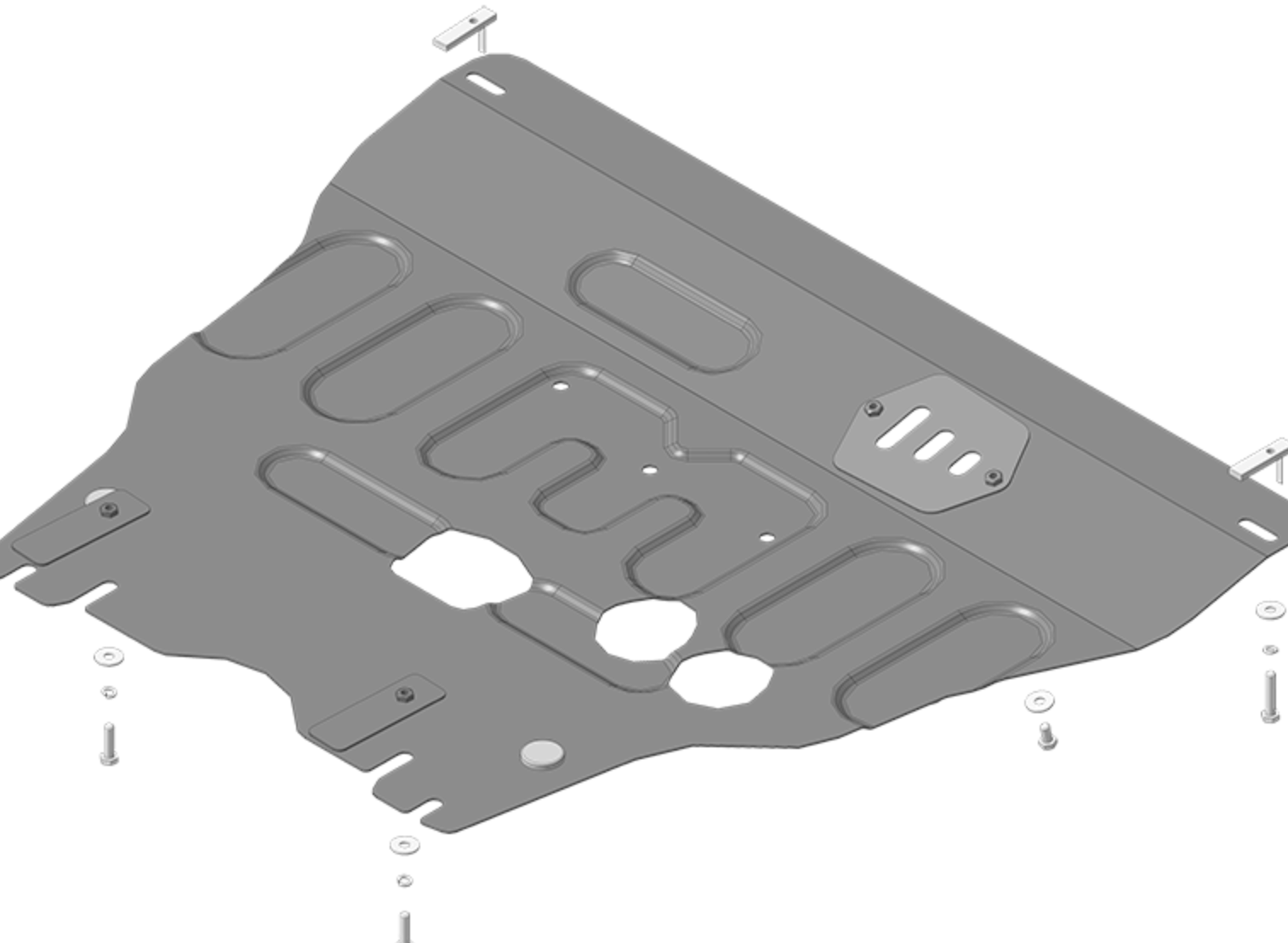 - Особенности : Защита устанавливается на переднеприводные автомобили выпуска до 2014 года и на полноприводные гибридные автомобили с 2014 года. Также защита имеет отверстия для фильтра и слива масла картера.